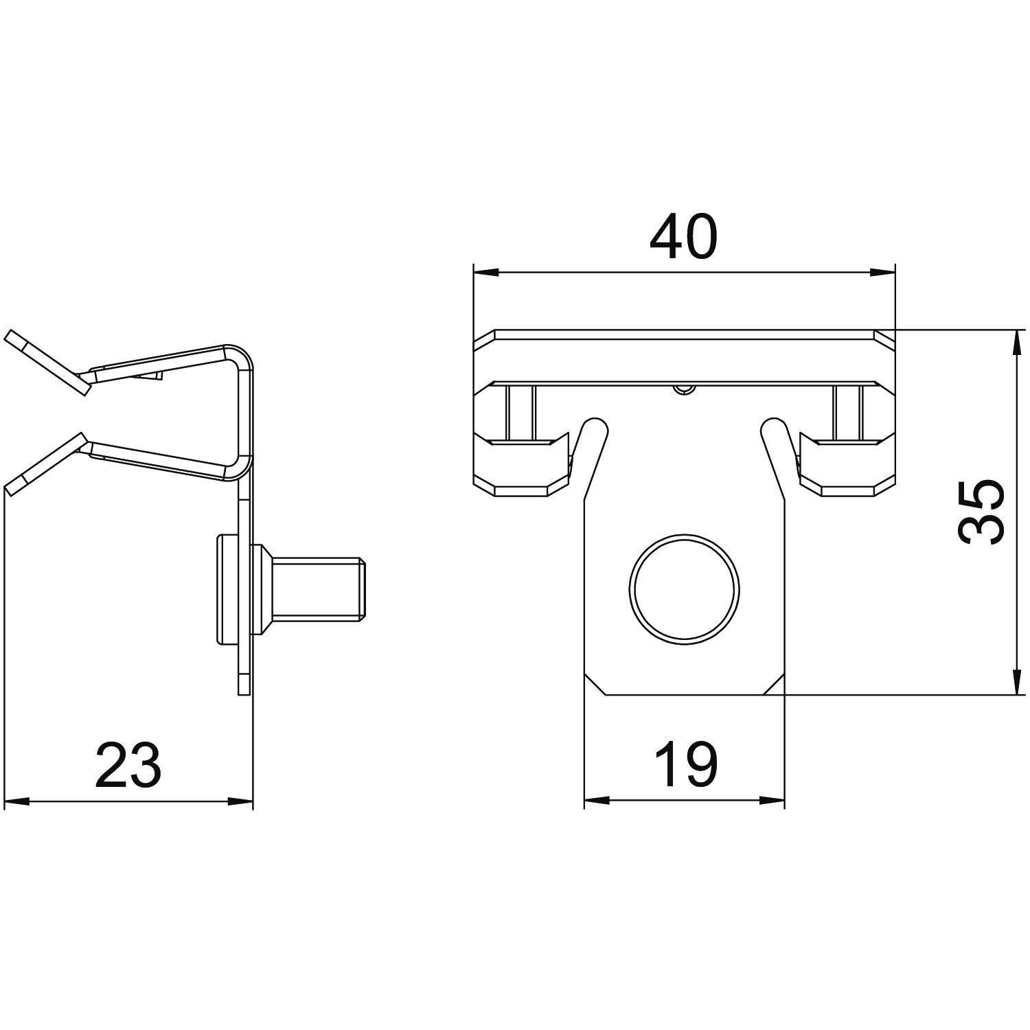 Ar eņģēm nē Atloka biezums F maks. 10 mm Atloka biezums F min. 4 mm Augstums 23 mm Eņģes, regulējamas nē Garums 35 mm Izmērs 4-10mm Izmērs L 35 mm Krāsa cinks Materiāls Tērauds Metriskā vītne 6 Min. pārraušanas spēks 0,45 kN Pievienojuma veids / būvdetaļa Vītne Platums 40 mm Stiprinājuma veids Spailes Virsma Cinka lamele - Visi tipi