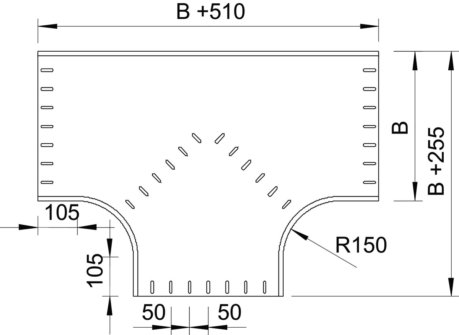 Apaļas formas fasondetaļa. Fasondetaļas iekšējais rādiuss ir 150 mm. Visas malas ir paredzētas vienāda platuma kabeļu renēm.