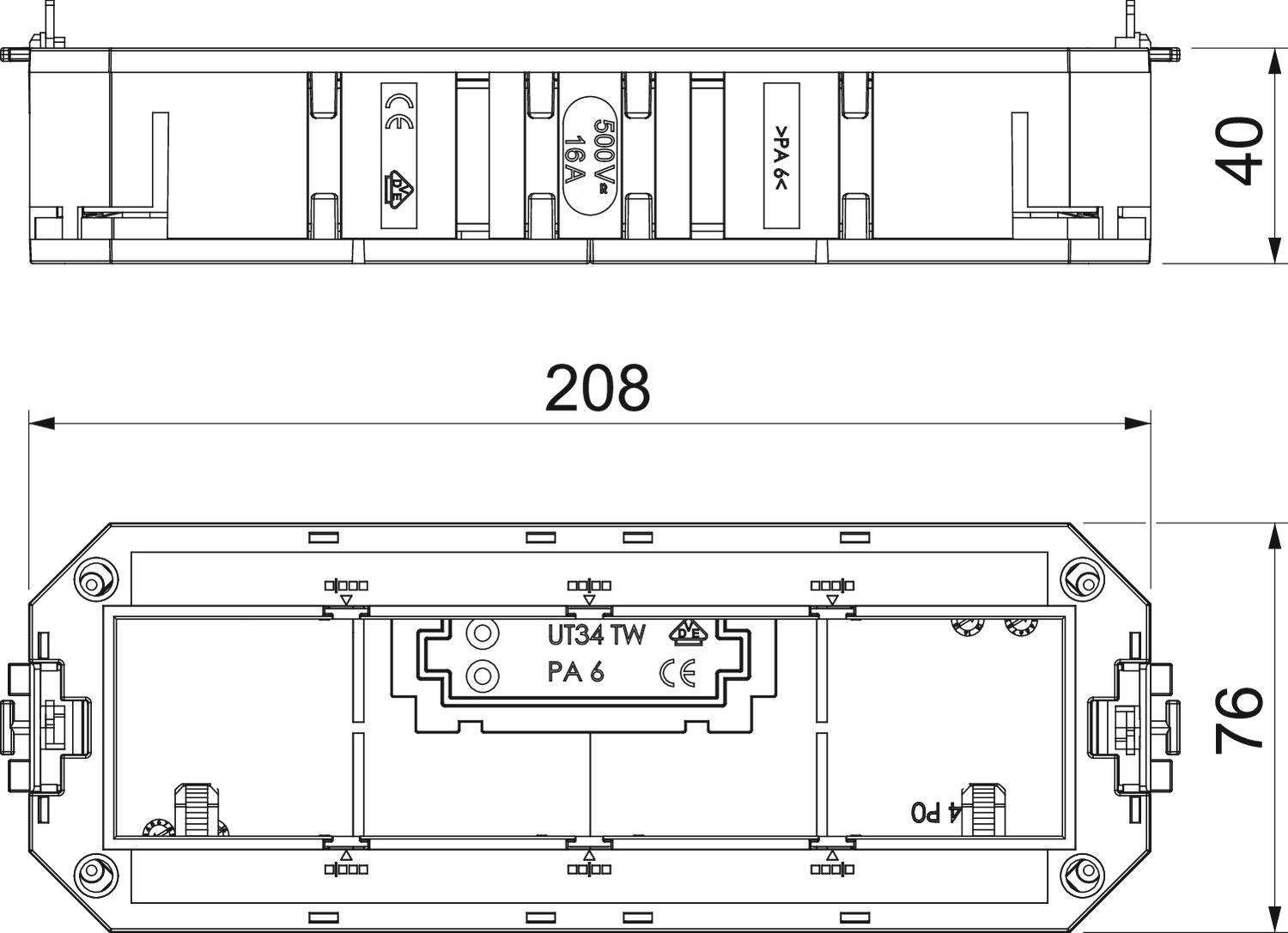 Augstums 40 mm CO2 pēdas nospiedums (GWP) no šūpuļa līdz vārtiem 0,6706 kg CO2e / 1 Gabals Garums 208 mm Iebūvējamo ierīču skaits 4 Ievadu skaits 4 Instalācijas tehnika Režģa izmērs M45 Izmērs 208x76x40 Izpildījums Kausa forma Kabeļu nostiepju skaits 2 Krāsa grafītmelns; RAL 9011 Materiāls Poliamīds Platums 76 mm - Visi tipi