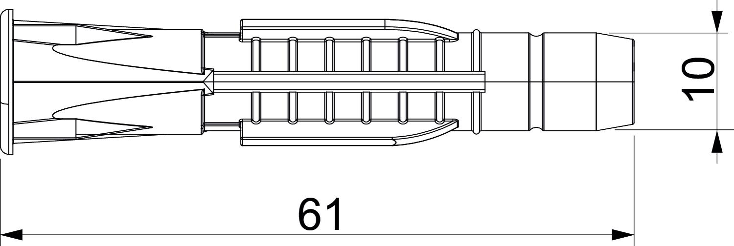 Ar skrūvēm nē Diametrs 10 mm Izmērs 10x61 Izmērs D 10 mm Izmērs L 61 mm Izpildījums Universālais dībelis Koka skrūves 7-8 Krāsa gaiši pelēks Materiāls Poliamīds Piemērots nostiprināšanai ar kabeļu saitēm nē Piemērots sešstūrgalvas kokskrūvei jā Urbtā cauruma diametrs min. 10 mm - Visi tipi