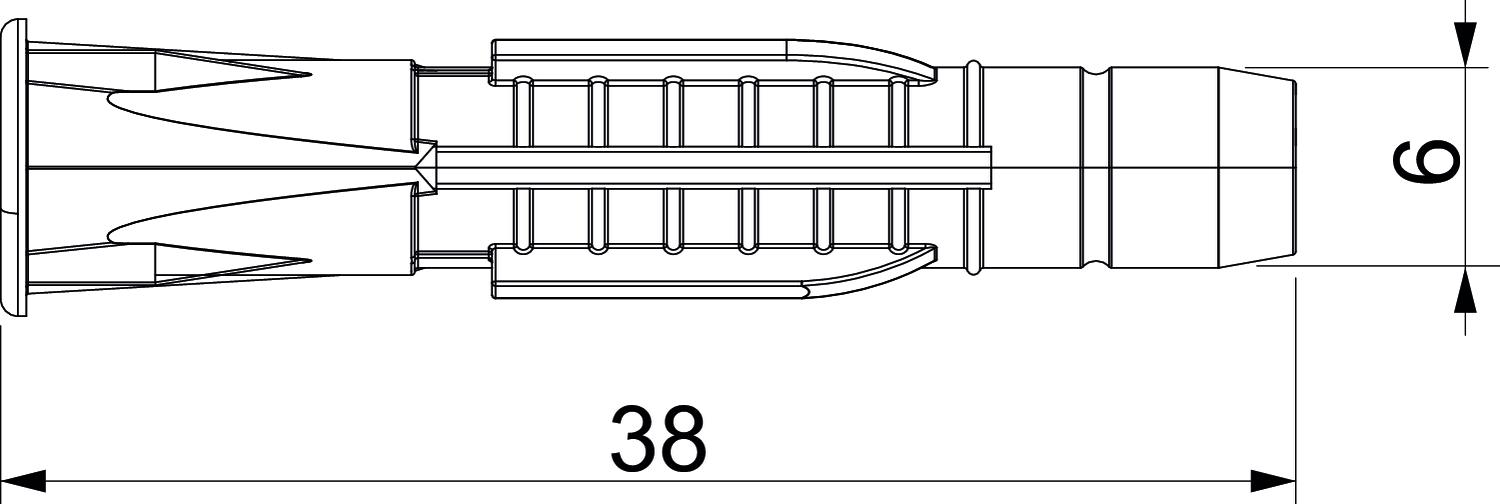 Ar skrūvēm nē Diametrs 6 mm Izmērs 6x38 Izmērs D 6 mm Izmērs L 38 mm Izpildījums Universālais dībelis Koka skrūves 4-5 Krāsa gaiši pelēks Materiāls Poliamīds Piemērots nostiprināšanai ar kabeļu saitēm nē Piemērots sešstūrgalvas kokskrūvei jā Urbtā cauruma diametrs min. 6 mm - Visi tipi
