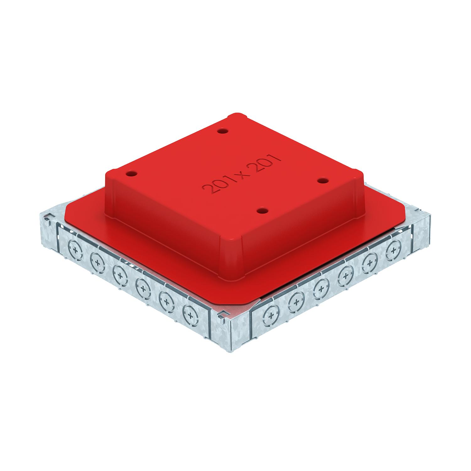 Produkta aprakstsZemgrīdas pieslēguma kārba ar fiksētu un nemainīgu montāžas atveri 201 x 201 mm iebūvējamajai vienībai ar nominālo izmēru 4. Montāžas atvere tiek izveidota, izmantojot piegādes komplektācijā ietverto kausveida elementu. Zemgrīdas kārbā ir montāžas atveres 2 vai 3 sekciju tērauda loksnes zemgrīdas kanālam ar nominālo izmēru 25038, kā arī sešām instalācijas caurulēm M20 vai M25 visās četrās pusēs. Kārba principā ir piemērota izmantošanai grīdas konstrukcijās ar cementa pamatni, ar konstrukcijas augstumu līdz 90 mm.