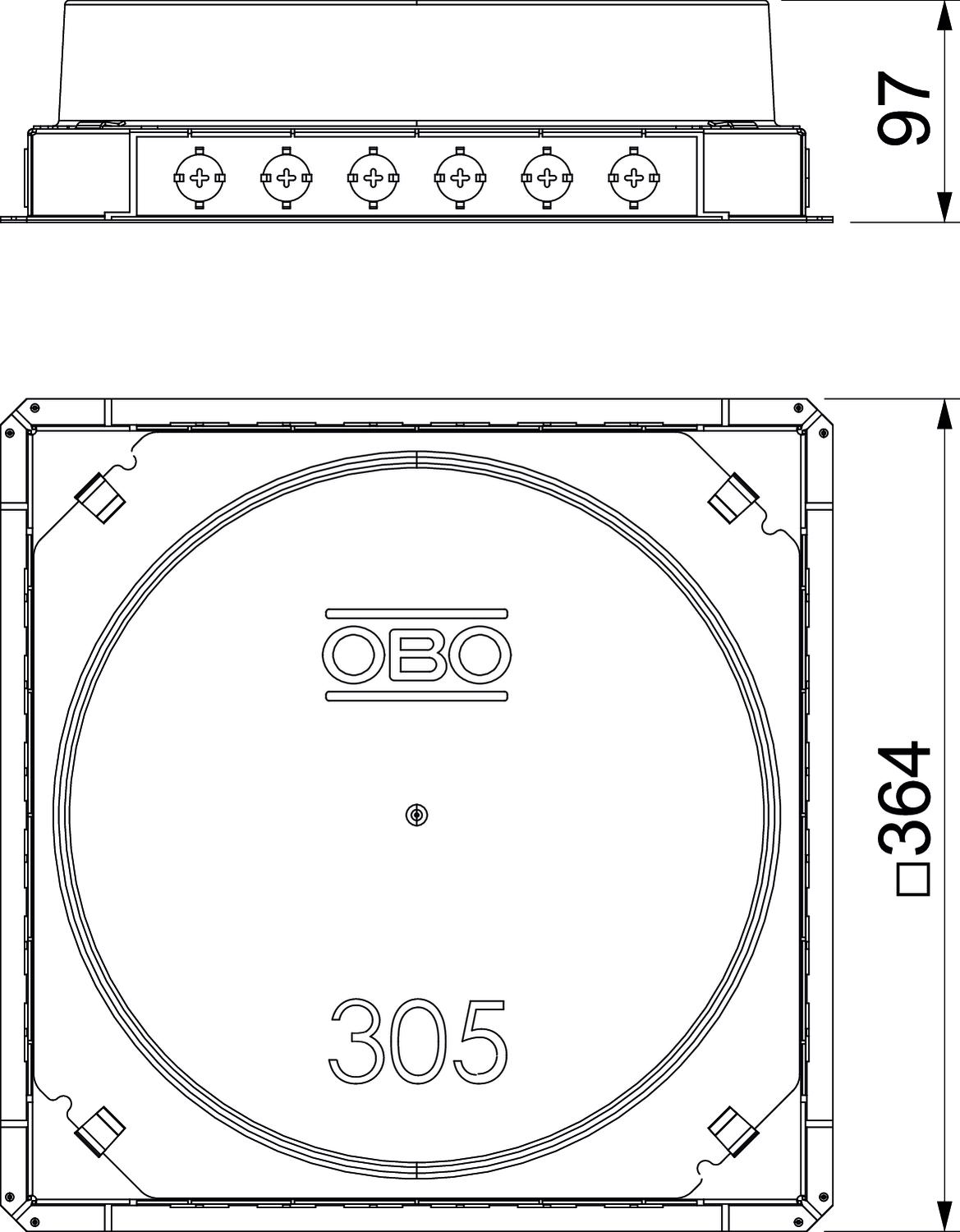 Produkta aprakstsZemgrīdas pieslēguma kārba ar fiksētu un nemainīgu montāžas atveri Ø 305 iebūvējamajai vienībai ar nominālo izmēru R9. Montāžas atvere tiek izveidota, izmantojot piegādes komplektācijā ietverto kausveida elementu. Zemgrīdas kārbā ir montāžas atveres 2 vai 3 sekciju tērauda loksnes zemgrīdas kanālam ar nominālo izmēru 25038, kā arī sešām instalācijas caurulēm M20 vai M25 visās četrās pusēs. Kārba principā ir piemērota izmantošanai grīdas konstrukcijās ar cementa pamatni, ar konstrukcijas augstumu līdz 95 mm.