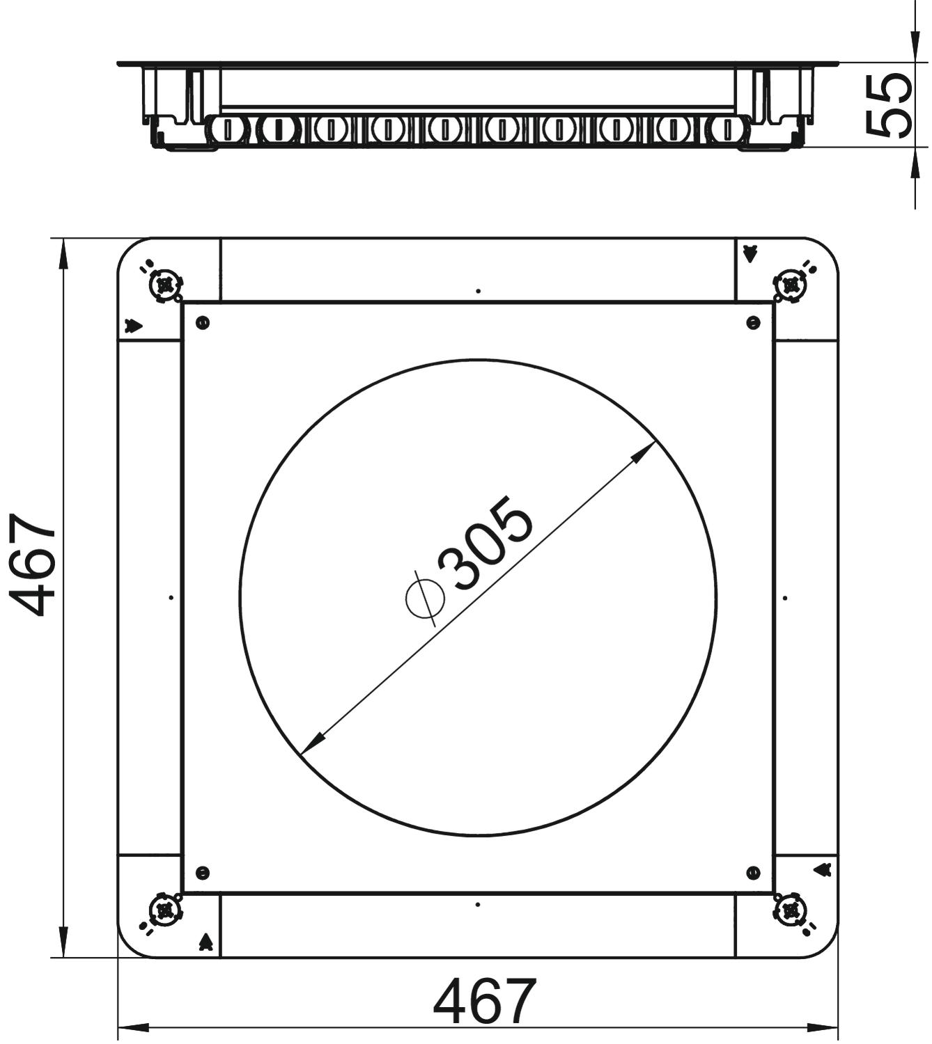 Produkta aprakstsZemgrīdas ierīču kārba ar montāžas vāku un vāka nosegplāksni ar sānu sienām no tērauda loksnes. Kvadrātveida ierīču montāžas moduļa GES9/55 montāžai betona grīdās, sākot no 55 mm. Var bez pakāpēm noregulēt uz betona grīdas augstumu un klonu var pieguļoši iestrādāt pie klona novilkšanas malas. Ar atverēm cauruļu ievietošanai katrā pusē: 7 x M20, 3 x M25, 4 x M32. Lietderīgais caurules lielums, ja sistēmas augstums ir 55 mm: M20.