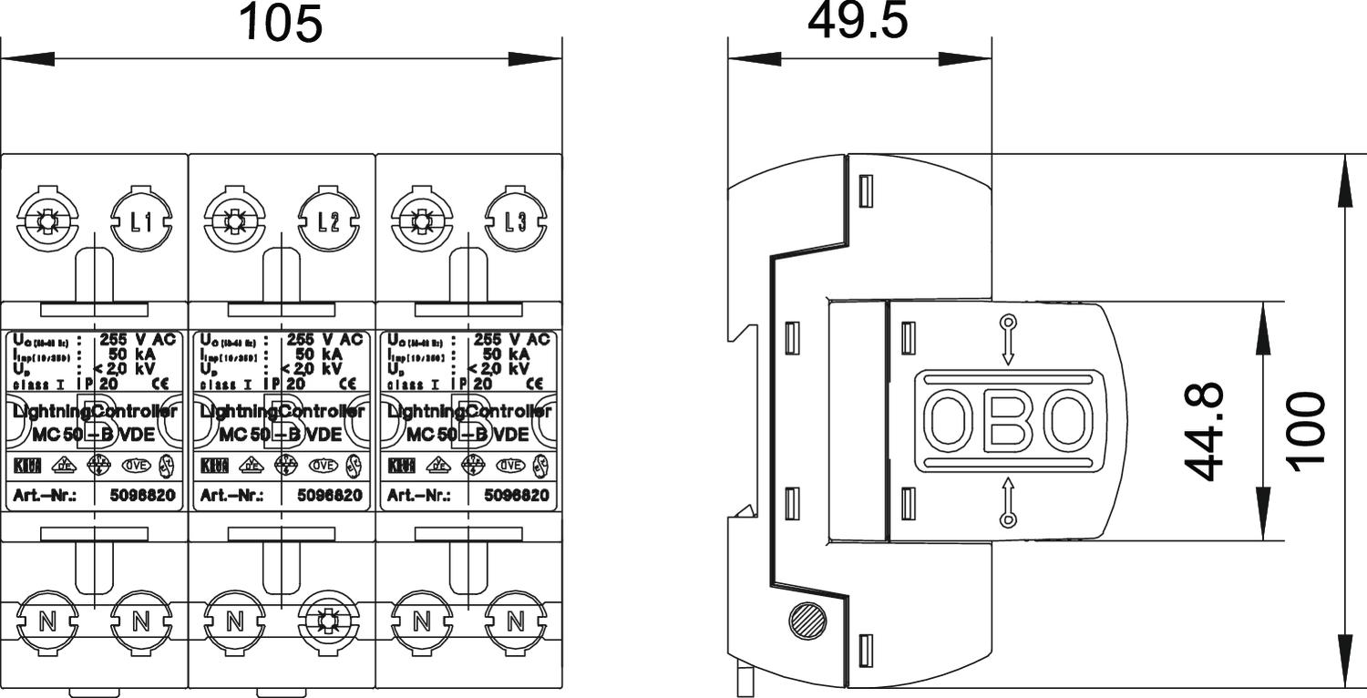 Zibens novadītājs, tips 1 atb. EN 61643-11 paredzēts pieslēgvietai 0 uz 1 (LPZ) saskaņā ar zibensaizsardzības zonu koncepciju atb. IEC 61312-1 vai DIN VDE 0185-305.