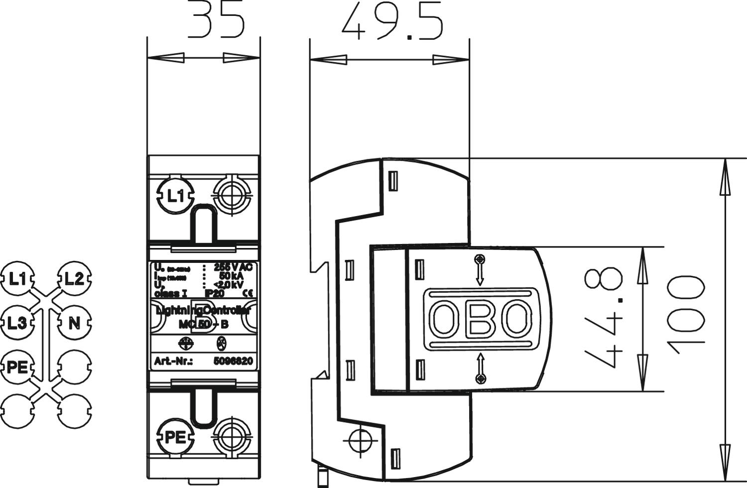 Produkta aprakstsZibens novadītājs, tips 1 atb. DIN EN 61643-11 pieslēgvietai 0 uz 1 (LPZ), saskaņā ar zibensaizsardzības zonu koncepciju atb. IEC 61312-1 vai VDE 0185-305 (IEC 62305)