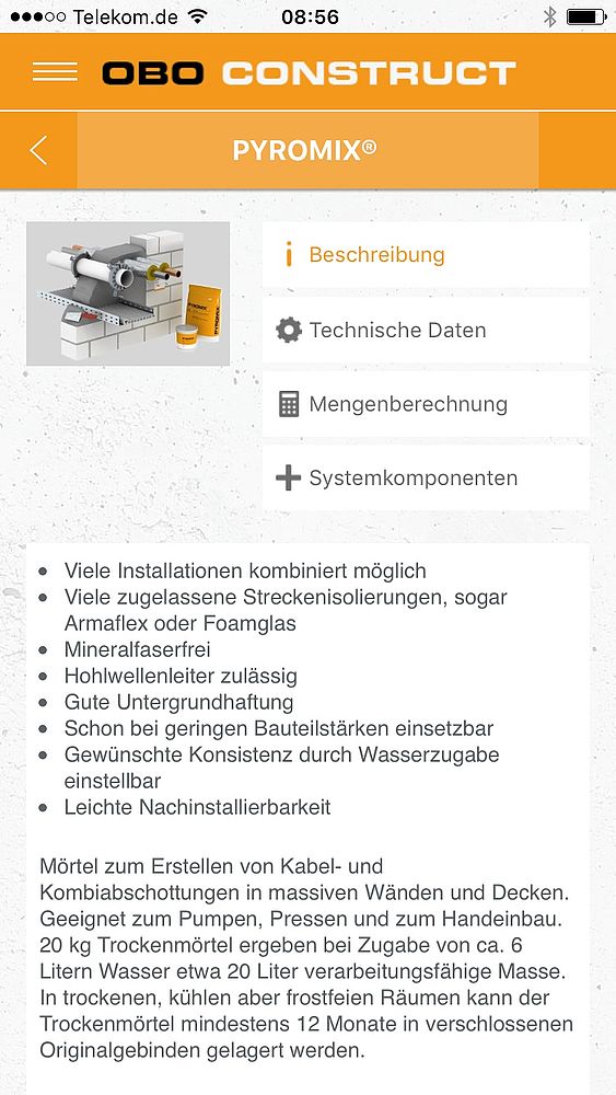 Būtiskā informācija, piemēram, piemērojamības standarti, sertifikātu numuri un kontroles standarti, attēlota tieši uz izstrādājuma. Tādējādi varat pārliecināties, ka izvēlētais izstrādājums atbilst jūsu prasībām. Atvieglojiet ikdienas ugunsdrošības projektēšanas darbus, izmantojot OBO Bettermann lietotni OBO Construct BSS.