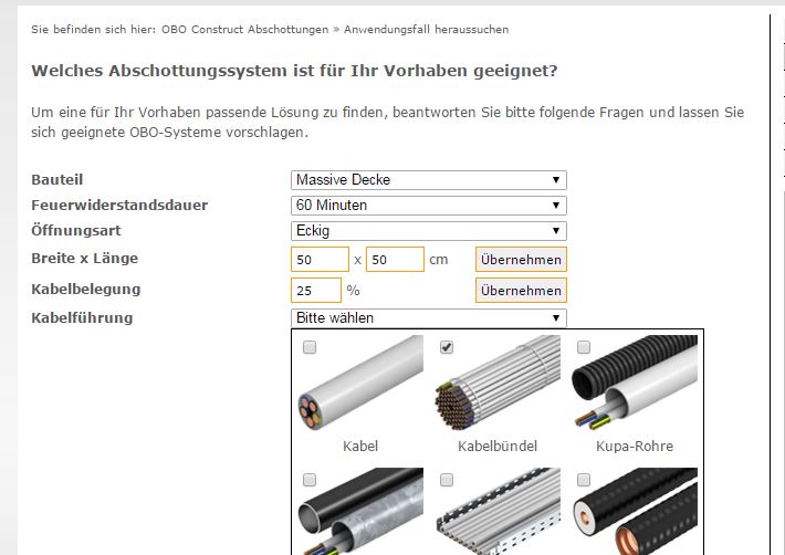 Šis tiešsaistes rīks palīdzēs jums izvēlēties jūsu individuālajam projektam piemērotas ugunsdrošības sistēmas. Neatkarīgi no tā, vai jau pārzināt OBO ugunsdrošības sistēmas vai arī vēlaties saņemt ieteikumus par savam projektam piemērotām OBO ugunsdrošības sistēmām, ir iespējams ātri, ērti un mērķtiecīgi izveidot, apstrādāt un eksportēt savu individuālo izstrādājumu sarakstu.